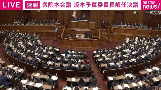 衆院本会議で、坂本哲志予算委員長の解任決議案が提出され、与野党が激しく対立した。改革連合の伊佐議員は、過去最短の審議時間で最大規模の予算案が成立したことを問題視し、坂本委員長の責任を追及。一方、自民党の渡嘉敷議員は、野党が「日程闘争」に終始したと反論し、委員長を擁護。採決の結果、解任決議案は否決された。